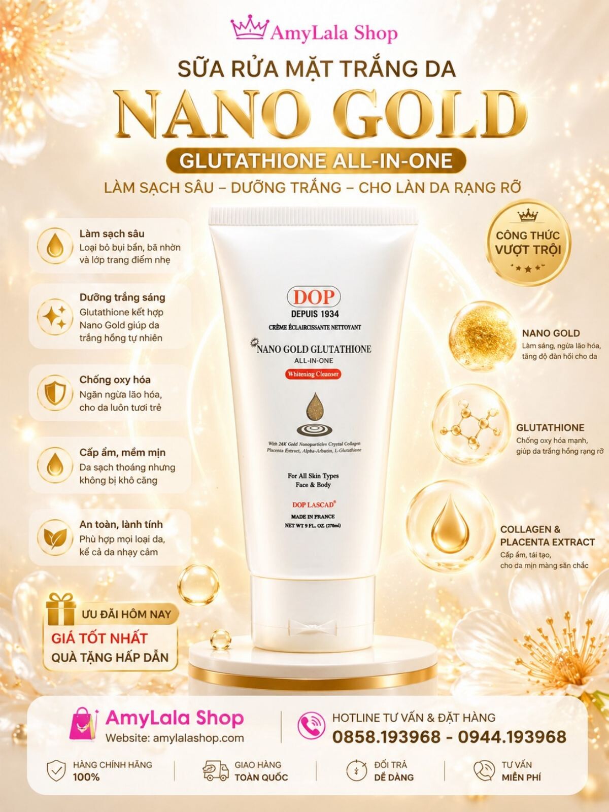- Sữa tắm/rửa mặt hạt Nanoparticles của vàng 24k trắng da Dop Lascad® Nano Gold Glutathione được Cửa Hàng Kinh Doanh Bách Hóa Dược Mỹ Phẩm AMYLALA SHOP (CÔNG TY TNHH TM-DV ĐẠI AN PHƯỚC) nhập khẩu từ Pháp đảm bảo an toàn và trắng da hiệu quả. Hiệu quả làm trắng diễn ra từ từ nhưng chắc chắn, không làm vàng lông và phục hồi tế bào mới cho da giúp da bạn mau trắng hồng tự nhiên. Đặc biệt là không hề hại da do hoàn toàn từ thiên nhiên. Hotline: 0858.193968 (Zalo) - 0944.193968 (Zalo)